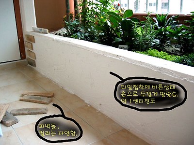 두껍게 타일접착제를 바른게 아랫사진에 보이시죠?..^^... 머 타일붙일때 이게 정석은 아닐지는 몰라도 저처럼 규격안맞게 컨츄리하게 붙이실분들은 참고하셔요.^^ ![]()