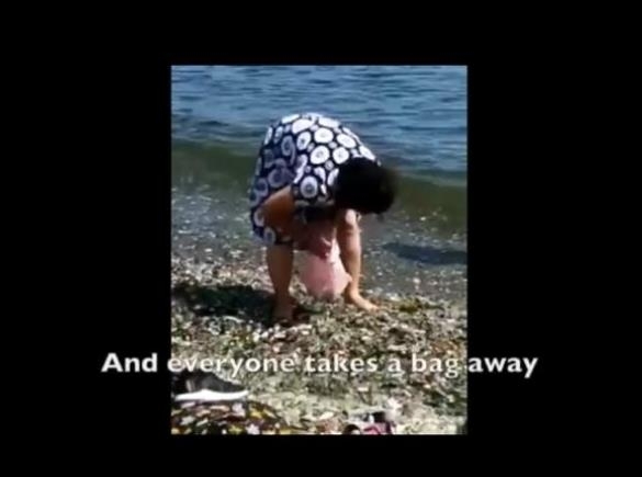 유리 해변에서 유리를 주워가는 중국인 관광객의 모습.
