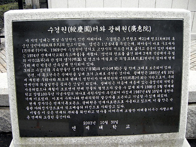 당쟁의 제물로 비명에 숨진 비운의 왕자 사도세자(장헌세자)와 효장세자(일찍 죽음)의 친모이자 영조대왕의 후궁인 영빈 이씨. 이곳에 자리하던 영빈 전의(全義) 이씨의 원묘 수경원이 1968년 6월 경기도 고양군 신도면 서오능으로 206년만에 이장하였으나 당시의 정자각과 비각은 지금도 그대로 보존 되어있다. 이조 21대 영조대왕 후궁 영빈 이씨는 1696년에 서울 근교에서 출생해서 6살이 되던 해 궁중에 들어가게 되었다. 숙의와 귀인을 거쳐 30세 되던 해인 1726년. 정성왕후 서씨와 영조의 계비 정순왕후 김씨가 자식을 얻지 못하자, 영조는 귀인이던 이씨를 빈으로 모셨다. 1764년 영조 40년 7월 26일 향년 69세로 타계한 소유영빈은 생전에 2남 6녀를 두었다. 그중 사도세자가 28세의 젊은 나이에 당쟁의 소용돌이로 뒤주에서 굶어죽는 참변을 겪고, 게다가 어린 나이의 효장세자가 요절하는 비극을 몸소 겪는 등, 파란 많은 생애를 보냈다.