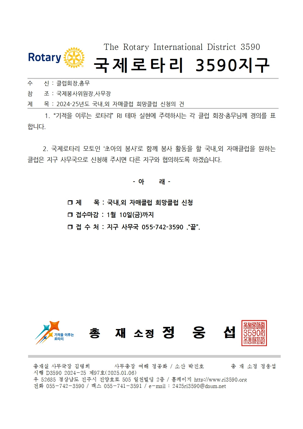 2024-25년도 국내.외 자매클럽 희망클럽 신청의 건 작성자사무장|작성시간25.01.07|조회수2 목록 댓글 0 글자크기 작게가 글자크기 크게가 다음검색 현재 게시글 추가 기능 열기 북마크 공유하기 신고 센터로 신고 댓글 댓글 0 댓글쓰기 답글쓰기 댓글 리스트
