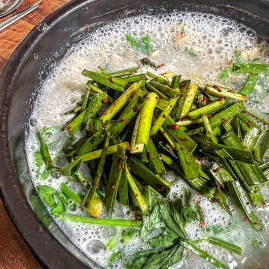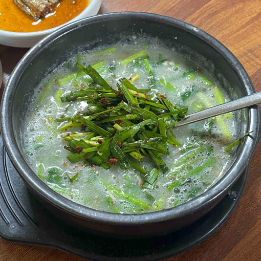 보글보글 끓을 때 부추무침을 넣어 간을 하고 개운한 맛을 원한다면 식초를 첨가할 것.