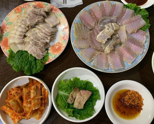 홍어는 접시 중앙부터 가장 많이 삭힌 부위를, 접시 가장 자리는 가장 덜 삭힌 부위가 담겨 나온다.