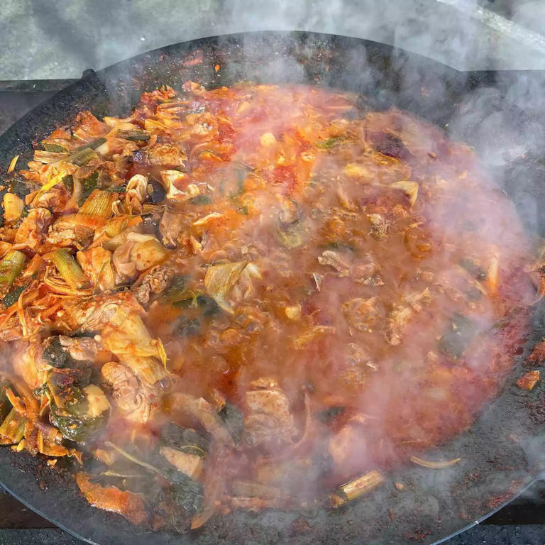 입구에서 부터 커다란 솥뚜껑에 미리 조리 되고있는 닭볶음탕은 비주얼부터 장관이 따로 없다.