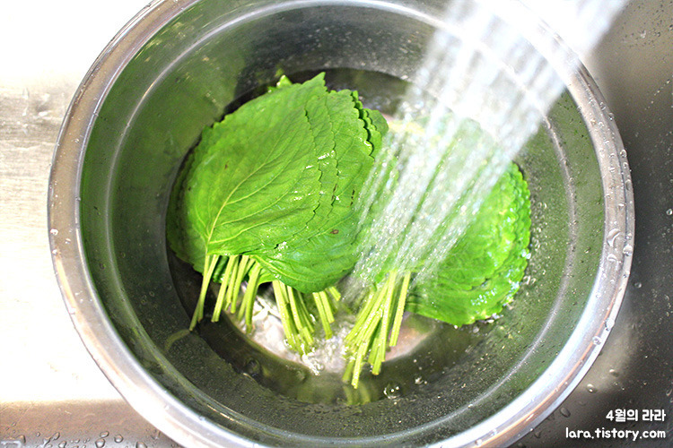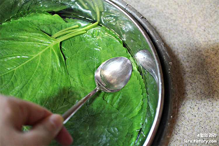 3. 소금물에 절인 깻잎 씻어서 물기 뺀다.