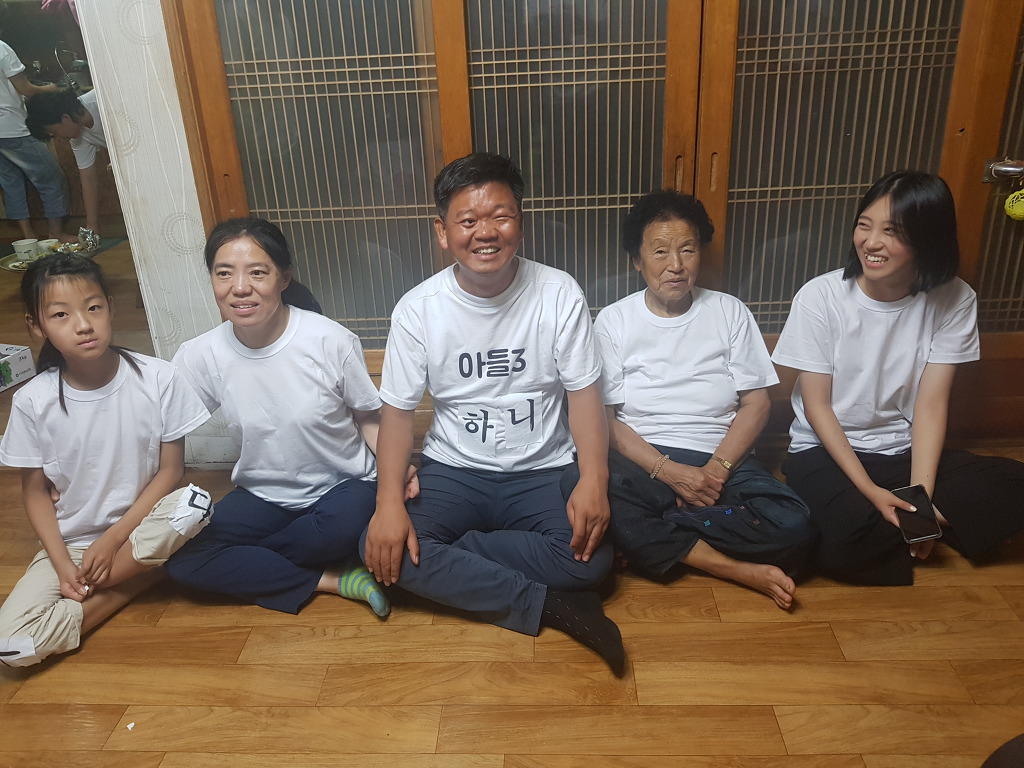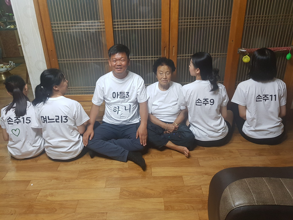엄마 유진이 내일 출근한다고 간다네 우리 식구랑 사진 한번 찍자 유진이가 손주3 유정이는 손주11 유빈이는 막내 손주15