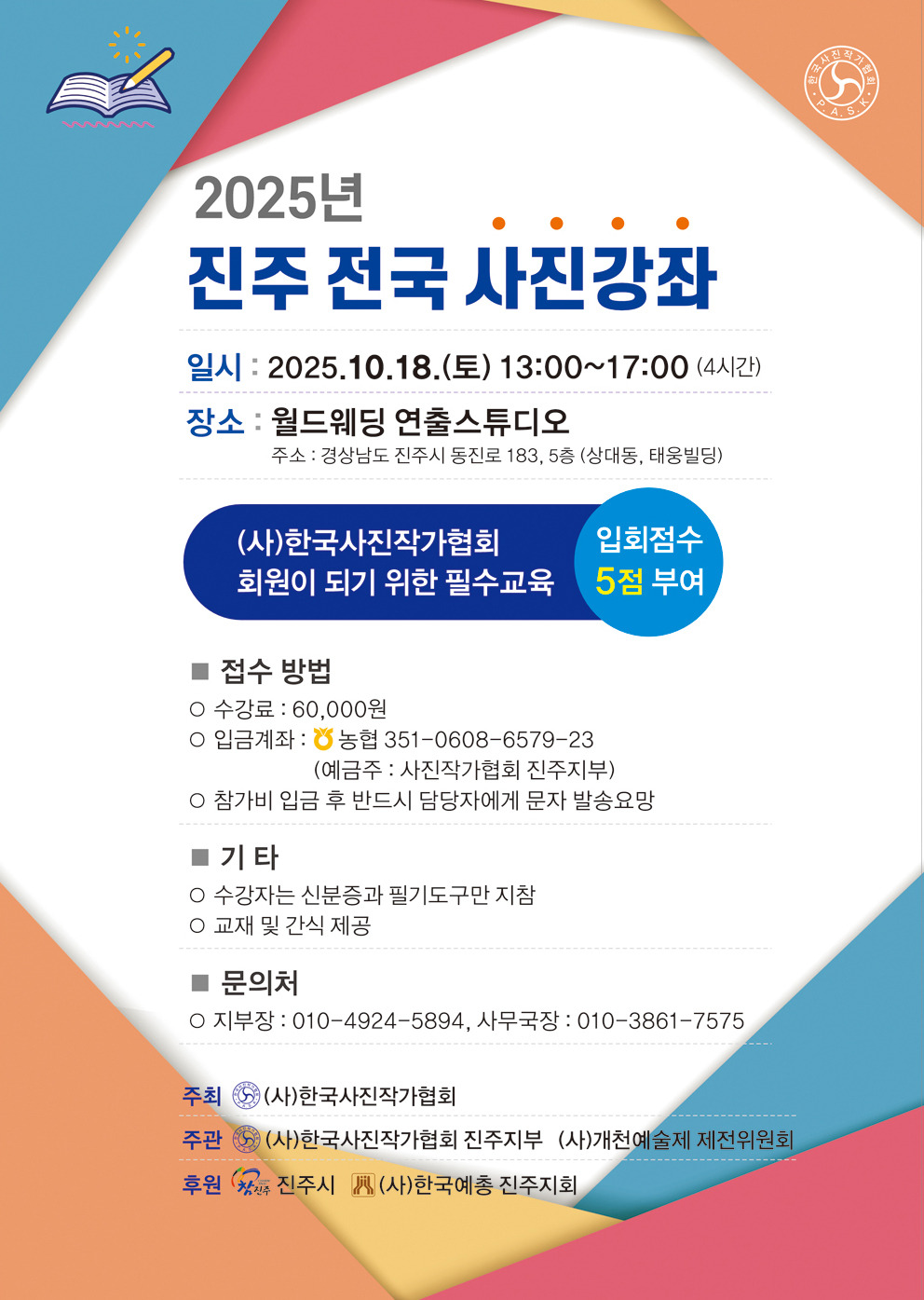 2025년 진주전국 사진강좌 작성자이현채(사무국장 및 카페지기)|작성시간26.01.26|조회수11 목록 댓글 0 글자크기 작게가 글자크기 크게가 다음검색 현재 게시글 추가 기능 열기 북마크 공유하기 신고 센터로 신고 댓글 댓글 0 댓글쓰기 답글쓰기 댓글 리스트