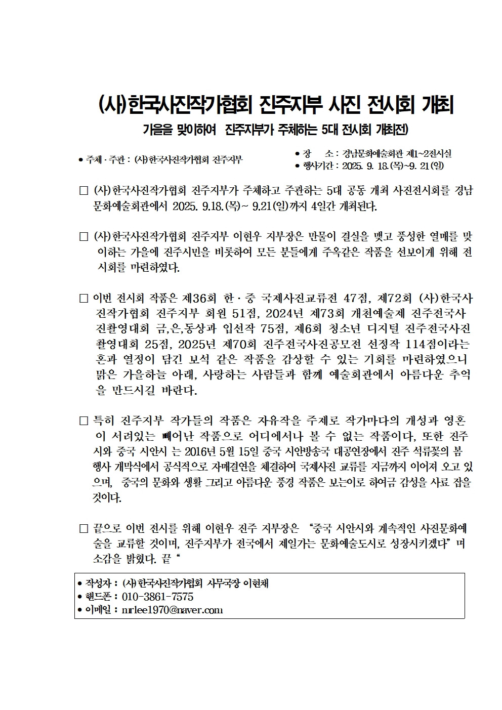 제36회 한.중 국제사진교류전 보도자료 작성자이현채(사무국장 및 카페지기)|작성시간25.11.03|조회수2 목록 댓글 0 글자크기 작게가 글자크기 크게가 다음검색 현재 게시글 추가 기능 열기 북마크 공유하기 신고 센터로 신고 댓글 댓글 0 댓글쓰기 답글쓰기 댓글 리스트