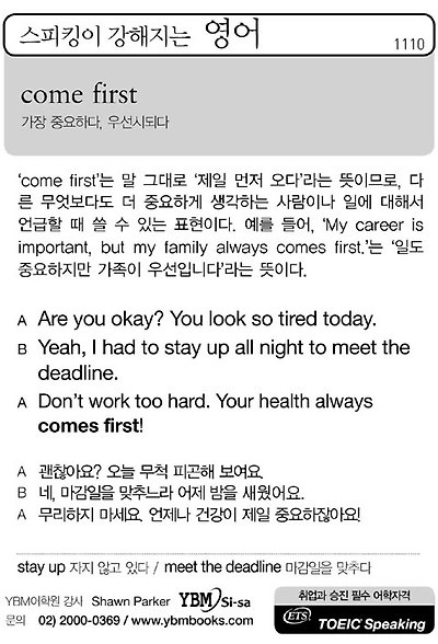 [스피킹이 강해지는 영어] come first 가장 중요하다, 우선시되다 작성자노진표|작성시간11.03.14|조회수80 목록 댓글 0 글자크기 작게가 글자크기 크게가 다음검색 현재 게시글 추가 기능 열기 북마크 공유하기 신고 센터로 신고 댓글 댓글 0 댓글쓰기 답글쓰기 댓글 리스트