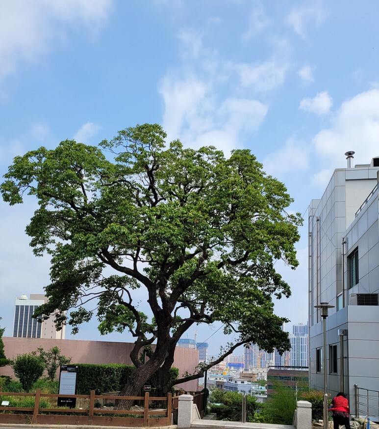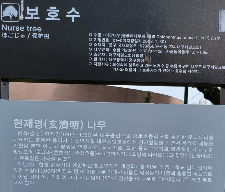 현재명나무란 이름을 달고 200년 된 이팝나무 한 그루가 제일교회 북쪽에 서있다. 남산동 출신이고 계성학교를 다녔으니 이 나무를 보고 악상을 떠올려 작곡가가 되었을 것으로 짐작하여 대구시에서 그의 이름을 따서 보호수로 지정하였다. 우리가 잘 아는 '희망의 나라로', '그집앞', 나물캐는 처녀', '고향생각' 같은 주옥같은 작품을 남겼다. 그러나 유감스럽게도 현재명은 친일인명사전에 약 3쪽 정도를 차지할만큼 친일행적을 남긴 사람이다. 우리가 보통 친일(親日)이라면 일본과 친한 게 뭔 좌가 되느냐 라고 생각하지만 여기서 말하는 친일이란 일본을 어버이처럼 생각하는 무리들을 가리킨다. 그져 친할 정도가 아니랴는 의미다. 그는 친일단체에 가입하고 일본을 찬양하는 곡을 썼으며, 조선임전보국단 발기인까지 한 인물인데 그를 기리는 나무를 보호수로 하다니 말이 아니다. 차라리 박태준나무가 어울리지 않을까.