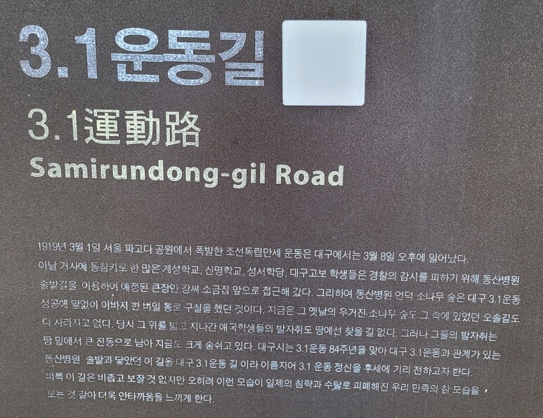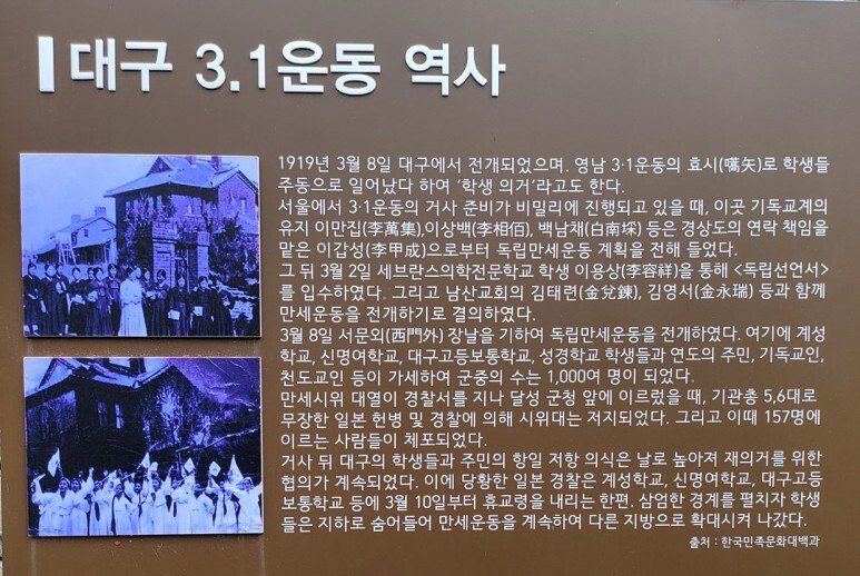 3.8만세운동길로 가보자. 대구의 3.1운동은 1주일 뒤인 8일(토), 동산 숲속에 비밀리에 모여 90계단을 따라 내려가 좌회전하여 옛동산파출소가 있었던 강씨 소금가게 앞에 모여 독립선언서를 읽고 독립만세를 외치며, 서문로를 따라 대구경찰서 앞에서 우회전하여 종로를 따라 옛 중앙파출소를 거쳐 대구백화점 부근 달성군청까지 행진해 갔다. 3월 4일과 7일에 거사를 주도했던 홍주일과 계성학교 백남채 교사가 체포되었고, 이갑성, 이만집, 김태련, 이재인교사(신명)등이 주도하고, 계성학교 46명, 신명학교 50명, 대구고보(현경북고) 200여명, 성결학교 20명이 참여했는데 오후 1시경 800여명으로 불어났다. 김태련 조사가 달구지 위에서 독립선언서를 낭독하다가 일경에 잡혀가자 이만집 목사가 뒤를 이어 낭독했다. 아버지 김태련이 잡혀가는 것을 항의하다가 아들 김용해(24세)도 잡혀갔고, 모진 고문을 받다가 가출옥한지 3일만에 죽음에 이르렀다. 김태련 조사는 감옥에서 이 소식을 듣고 그물을 짜서 3원 50전을 모아 비문을 세웠는데 일경의 감시를 피하고자 비명에 이름을 정훈으로 고치기까지 했다. 아! 이런 일이 있었다니……. 혈육이란 바로 이런게 아니던가. 두 분의 유해는 국립신암선열묘지에 모셨다니 그나마 위안이 되려나. 당시 주동했던 이만집, 김태련은 징역 3년과 2년 6월을, 김영서, 백남채, 최상원, 김무생은 징역 2년 등 많은 분들이 실형을 살았고, 225명이나 잡혀갔을 정도였으니 대구의 3.8만세운동을 짐작하고도 남는다.