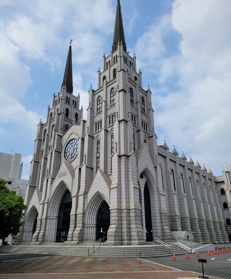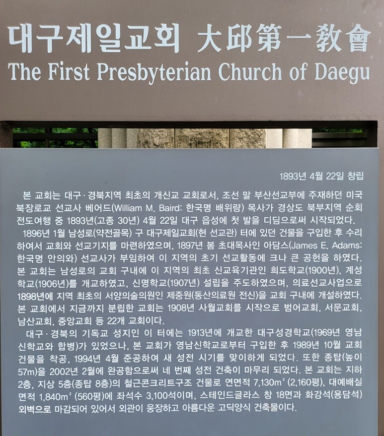 제일교회로 눈을 돌려본다. 1896년은 베어드(한국명 배위량)목사가 대구 남성로에서 첫 예비를 보기 시작한 해다. 100주년을 맞아 동산의 영남신학교 부지를 매입하여 1989년 기공식을 갸진 후 1994년 입당 예배를 보고, 첨탑이 완공된 것은 2002년이며, 제일교회가 새로운 역사를 동산동에서 열개된다. 동산 높이 48m, 종탑 높이 57m를 합치면 105m나 되는 최신 고딕식 화강암 교회당이 우뚝 서서 대구의 새로운 명물이 되있다. 지하 2층, 지상5층(종탑까지 8층)에 연면적 7130㎡(2160평), 대예배실 1840㎡(560평), 스태인드글라스 창문이 16면인 아름다운 건물이다.