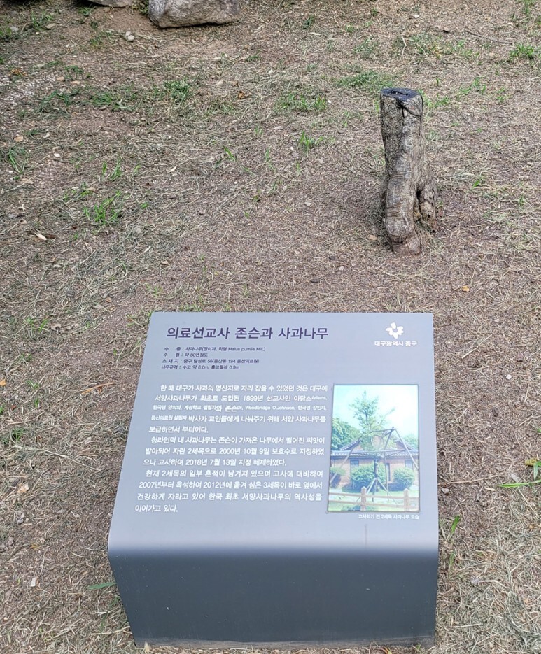능금시조목은 1900년 존슨 목사가 미국 미주리주에서 사과나무 묘목 72그루를 사들여 대구에 재배하였는데, 과즙과 맛이 재래종과 다른 품종이라 한 때 대구를 사과의 고장으로 이름을 날리게 하었다. 그 사과나무 2세목을 1998년 남산동 사택에서 스윗즈 주택 옆으로 이식해 대구시보호목으로 지정하여 명맥을 유지해 왔으나 오늘 와보니 밑둥을 싹둑 잘라 버렸다. 그러지않아도 비실비실했었지만 잘려나간 밑둥을 보노라니 씁쓸한 생각이 든다. 우리 인간도 저렇게 흔적조차 없이 샤라질 게 아닌가. 다행히 3세목 세그루가 잘 자라 열매까지 맺고 있어 위안이 된다.