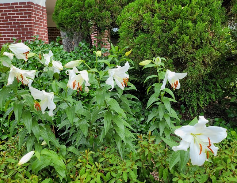 2009년에 세운 박태준의 동무생각 노래비가 자리를 빛내 준다. 한때는 여기를 해설하면서 시원찮은 노래까지 불러줬지만 오늘은 참았다. 유명한 작곡가인 박태준(1900~1986)은 약령서문 서쪽 계산동에서 출생하여 동산을 넘나들며, 계성학교를 다녔고, 이때 여기서 만났던 유인경이란 신명학교 학생을 짝사랑했었단다. 세월이 흘러 마산 창신학교 음악교사가 된 박태준은 국어교사였던 노산 이은상을 만나 그 유명한 '동무생각'이 탄생한 것이다. 마침 전에 없던 백합꽃이 만발하여 운치를 더해 주었다.