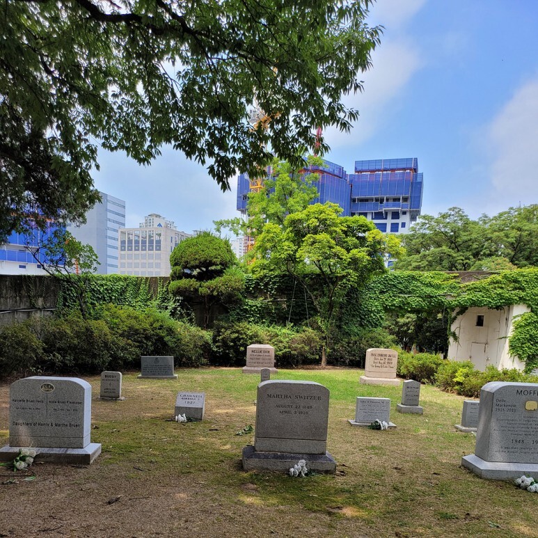 은혜정원은 선교사들과 가족묘지 이름이다. 맨 뒤 가운데 아담스 선교사의 부인 넬리 딕 아담스 묘지인데 묘지명에는 '그녀는 죽은 게 아니고 잠들어 있다'고 표현했으니 죽음도 이정도로 생각하면 얼마나 좋을까. 맨 앞줄 우측에는 동산병원장을 지내고 계명대학에 의과대학을 설립한 마펫(한국명 마포화열)선교사 내외분이 묻혀 있다. 귀국하여 2013년에 소천하며 유언으로 대구땅에 묻어달라는 뜻이 실현된 모습이다.