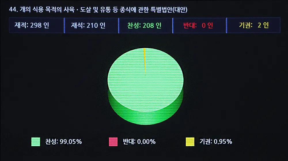 2024년 1월 9일, 해당 법안이 제411회 국회(임시회) 제4차 본회의에서 국회의원 재적 298인 중 재석 210인, 찬성 208인, 기권 2인, 반대 0인(찬성율 99.05%)으로 가결되었다. 이 법안은 2027년부터 시행되며 2027년부터 개고기의 제조와 유통이 완전히 금지된다.