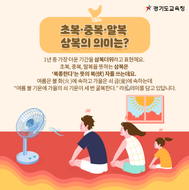 삼복은 가을의 기온이 내려오다 여름의 더운 기운이 강렬해 세 번 복종한다는 의미로 쓰이고요. 우리가 매년 무더위를 경험하는 양력 7월 중순부터 8월 중순 사이를 삼복이라 하는데, 크게 초복, 중복, 말복으로 나누어져요.