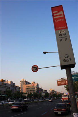 감삼못이 넓게 펼쳐져 있었던 광장타운아파트와 달성고등학교 일대가 지하철 감삼역 표지판 뒤로 보이는 풍경