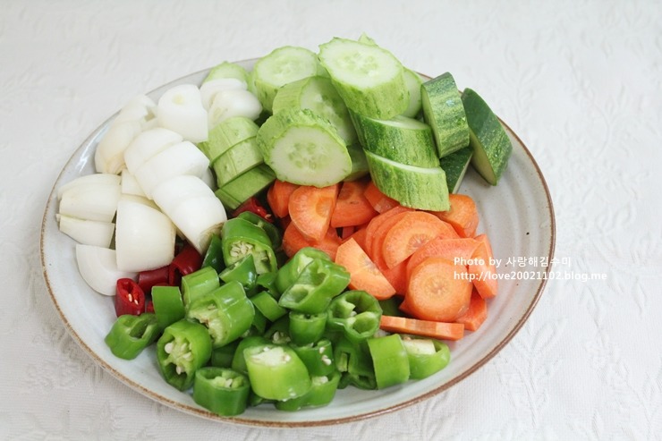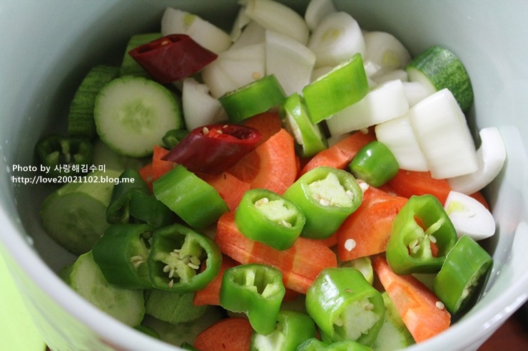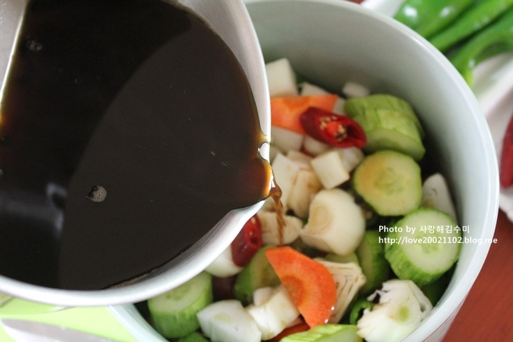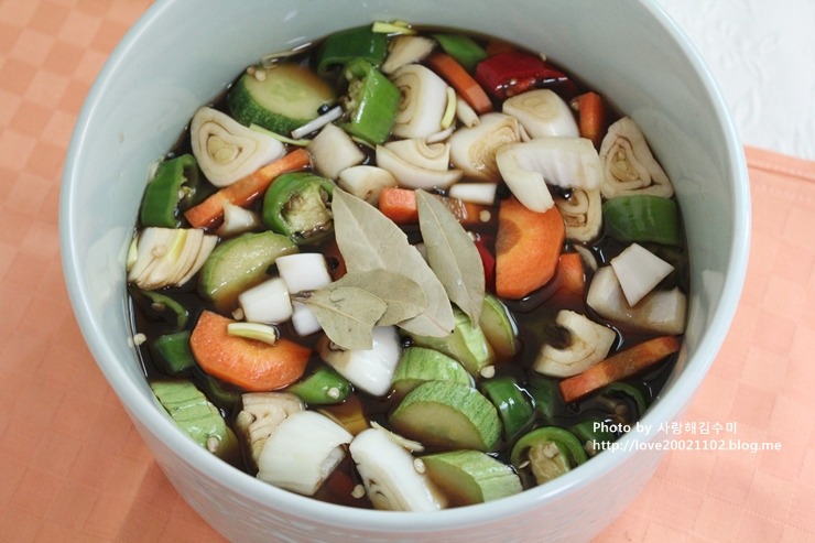 새콤 달콤하니 아삭아삭한 맛이 좋은 오이피클 사랑해네는 은근 오이피클, 양파피클, 무우, 파프리카등많이 만들어 먹어요. 고기요리를 좋아해서 고기랑 곁들이기도 하고 파스타 , 샌드위치 먹을때 곁들이기도 하거든요. 간단한 재료로 오랫동안두고 먹어도 아삭한 오이피클만드는법 이랍니다. 요즘 가장 흔하게 볼 수 있는 오이, 양파로 아삭함이 좋은 홈메이드피클만드는법 이랍니다. 청량고추를 넣어주면 새콤달콤함에 매콤한 맛까지 더해지지만 자극적인 맛인 청량고추를빼고 아삭이고추를 넣어주었답니다. 거기에, 흰설탕 대신 흑설탕을 넣어주었더니 색이 검은빛이 나긴하네요~. 1. 오이와 양파 , 아삭이고추는동글동글하게 잘라주세요 .. 먹기 편하게 썰어 주시면 어떤 모양이든 상관없겠죠 .. 당근은 반달모양으로 잘라주니까 이쁘더라구요~ 2. 설탕과 식초는 1:1 비율로 넣어주시면 된답니다 . 설탕 : 식초 : 물 = 1:1: 2.5 의 비율이면 새콤달콤한 오이피클이 만들어지고, 새콤한 맛을 약하게 하실 때는 물을 3컵 넣어주시거나 3.5 컵 넣어주시면 순한 맛의 오이피클이 만들어 진답니다. 3. 설탕은 흰설탕을 넣으면 채소의 색이 그대로 살아있는 오이피클만드는법이 되지만 , 집에서 먹는오이피클은흰설탕 보다는 중백당이나 비정제 설탕인 흑설탕을 이용하시면 좋답니다. 동아당한의원에서 아토피 치료 중에 배운것이 설탕을 사용할때 흰설탕 보다는 유기농흑설탕등 .. 진짜 흑설탕을 사용해서 요리를 하라고 하시더라구요. 그래서 , 사랑해 요리에 '설탕 넣으세요~' 하면 흑설탕이 많이 보이는 것이랍니다. 오이피클 같은경우 설탕이 많이 들어가기 때문에 흑설탕 당근 써주었답니다. 4. 물은 2.5 컵을 넣어주었는데 ... 약간 새콤한 맛을 좋아하시면 2.5컵이 좋고, 새콤한 맛보다는 순하게 오이피클 만드실때는 3컵~ 3.5컵 물을 넣어지면 된답니다. 입맛이 다르기 때문에 요리의 비율에는 정답이 없는것 같아요. 사랑해 동생네 오이피클을 만들어 줄때는 물3.5컵을 넣어서 쩡군도 먹을 수 있게 순한 맛의 오이피클만드는법을 해주거든요.. 5. 통후추는 1/2스푼 넣어주었어요. 은근 맛과 향이 좋아진답니다. 팔팔팔 오이피클 소스 재료들을 넣고 끓여주세요~~ 이렇게 팔팔 끓여서 한김 식혔다가 오이피클 재료에 부어주시면 된답니다. 완전 식히지 않고 , 한김만 빠질 정도 식혀주셨다가 부어주시면 아삭함이 오래오래 ~~ 가는 오이피클만드는법이 된답니다. 밀폐용기 (뜨거운것을 담아도 되는 유리형)나 밀폐가 되는 통에 담아 주시면 된답니다. 사랑해는 항아리에 담고 꽁꽁 밀폐를 시켜 주었어요~ 흑설탕을 넣었더니 .. 오이피클 소스 색깔이 간장같다는 ..ㅎㅎ 오이만 넣고 만들면 색이 검은 빛이 돌아서 별로 이뿌지는 않겠지만, 당근 , 홍고추 , 양파 등이 들어가기 때문에 완성되면 칙칙해 보이지 만은 안은 오이피클이 되더라구요~ 특히, 날씨가 더워지면 입맛 살리는데 새콤 달콤한 것이 좋잖아요 .. 오이피클 푸짐히만들어 놓으면 .. 요리에도 다양하게 부재료로 사용이 될 수 있어서 편하더라구요~ 오이피클은 병이나 밀폐되게 담아두시고 , 뜨거운 열기가 빠지면, 뚜껑을 덮고 냉장고에서 3일 정도 두셨다가 드시면 아삭아삭하니 .. 새콤달콤한 맛의 홈메이드 오이피클이 된답니다. 피클만드는법이 생각보다 많이 쉽죠~~ |