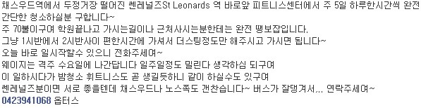 [구인구직] 노스지역 피트니스청소 작성자Summer|작성시간09.09.02|조회수175 목록 댓글 0 글자크기 작게가 글자크기 크게가 [구인구직] 노스지역 피트니스청소 급여: 시급 14$ * 이게시물은 정보 제공용이므로 저희 호주나라와는 무관함을 알려드립니다. 다음검색 현재 게시글 추가 기능 열기 북마크 공유하기 신고 센터로 신고 댓글 댓글 0 댓글쓰기 답글쓰기 댓글 리스트