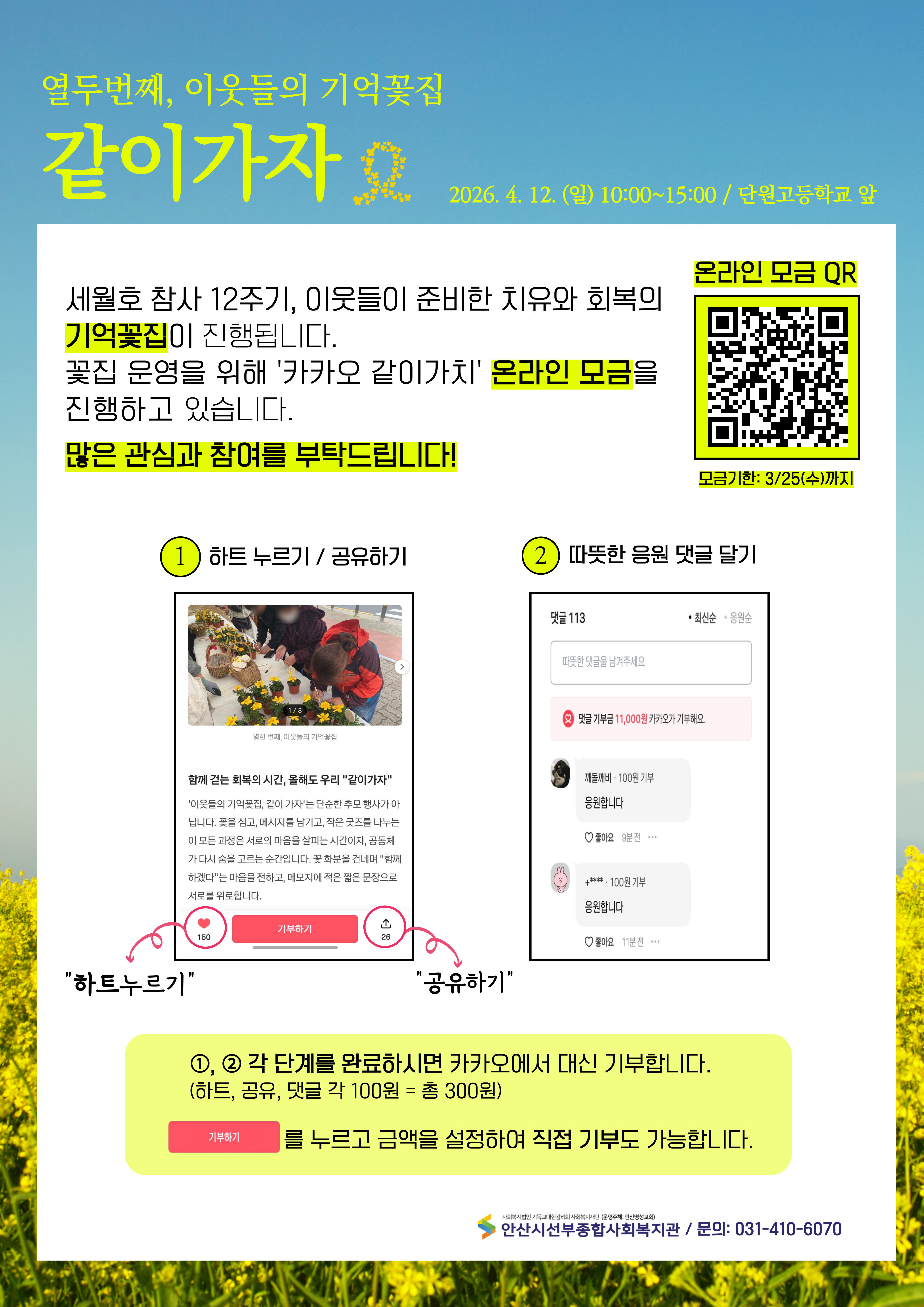 기억꽃집 '카카오 같이가치' 온라인모금 참여 요청 작성자안산지혜샘지역아동센터|작성시간26.03.16|조회수159 목록 댓글 1 글자크기 작게가 글자크기 크게가 다음검색 현재 게시글 추가 기능 열기 북마크 공유하기 신고 센터로 신고 댓글 댓글 1 댓글쓰기 답글쓰기 댓글 리스트 작성자부곡(이경화) | 작성시간 26.03.17 부곡입니다~~ 실천했고, 기부도하였습니다~~ 댓글 전체보기