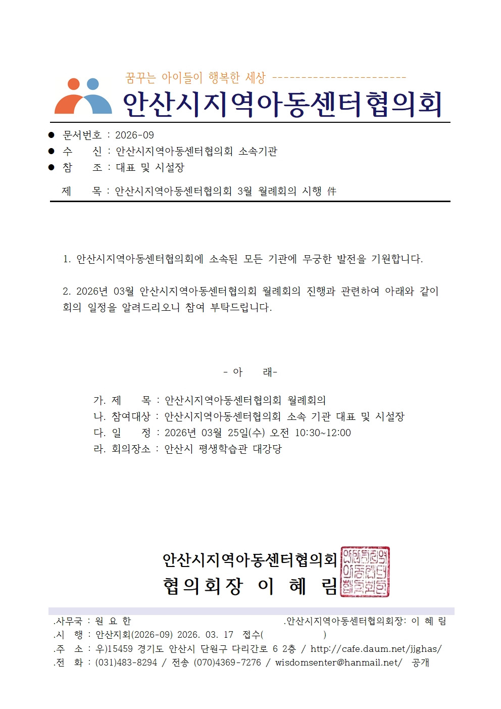 26년 3월 월례회의 공지 작성자안산지혜샘지역아동센터|작성시간26.03.17|조회수181 목록 댓글 0 글자크기 작게가 글자크기 크게가 다음검색 현재 게시글 추가 기능 열기 북마크 공유하기 신고 센터로 신고 댓글 댓글 0 댓글쓰기 답글쓰기 댓글 리스트