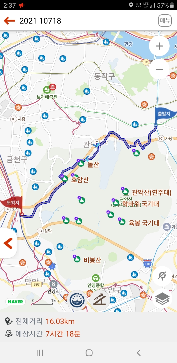 산행코스 = 사당역-관음사국기봉-낙성대-관악산입구-돌산국기봉