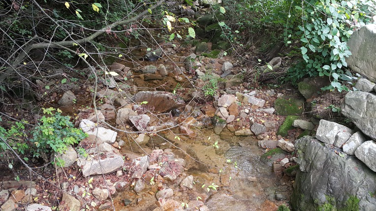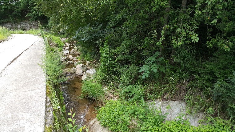 부지따라 접한 4m 포장도로와 청텅 소개울이 길따라 옵니다