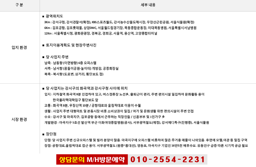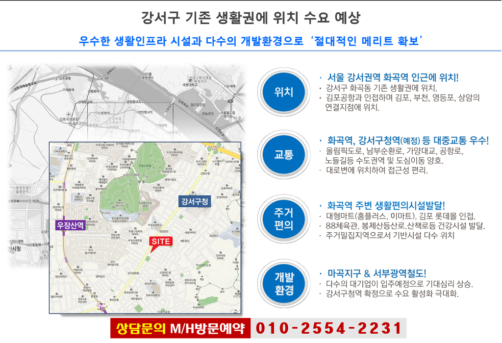 분양가에 95%에 육박하는 전세가 시장도 형성되어 있는 지역으로 전세,월세 할것 없이 임대시장이 좋으며 계속해서 유입되는 마곡지구에 입주기업과 향후 개통될 서부광역철도 까지 지가상승 여력이 아직도 무궁무진 합니다.