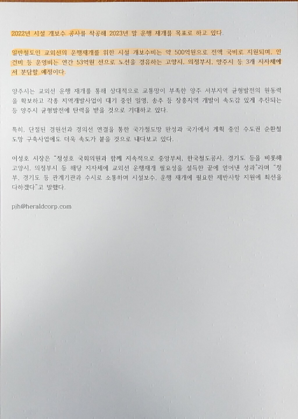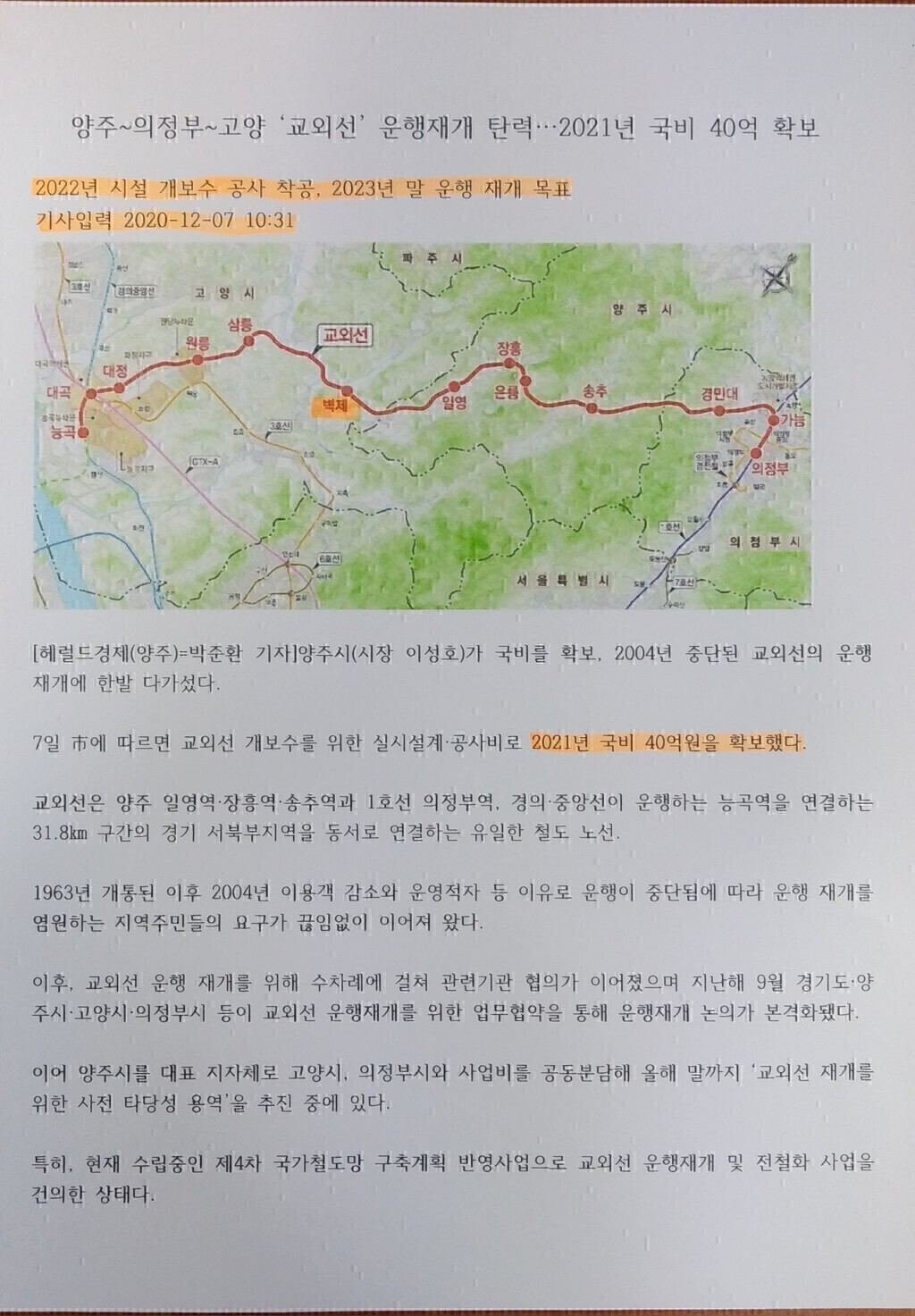 (교외선 철도 재개통 확정... 보도기사-2020.12.7.)