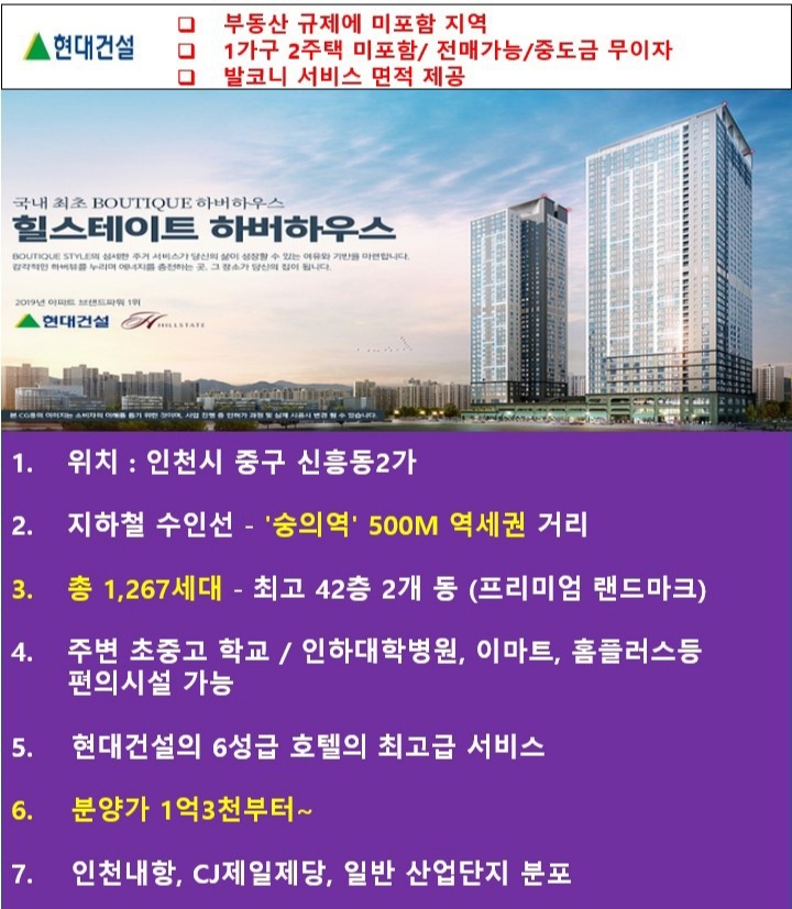 ■ 현대건설 - 힐스테이트 하버하우스 ■ 작성자엘라망고|작성시간21.02.18|조회수32 목록 댓글 0 글자크기 작게가 글자크기 크게가 ■ 현대건설 - 힐스테이트 하버하우스 ■ ■ 1,267세대 대단지 프리미엄■ 1가구2주택 해당없음■ 전매제한 없음■ 종합부동산세 합산 배제■ 중도금 전액 무이자 (분양문의 : 1600 - 5744) 다음검색 현재 게시글 추가 기능 열기 북마크 공유하기 신고 센터로 신고 댓글 댓글 0 댓글쓰기 답글쓰기 댓글 리스트