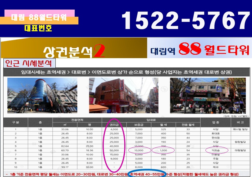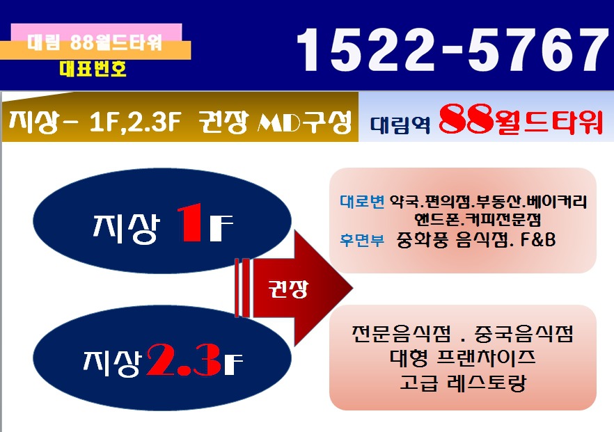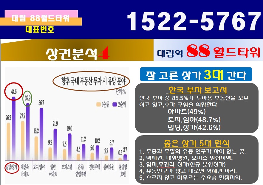 대림역 88월드타워는 권리금 및 임차료를 감당하느니 점포를 매입해 직접 운영하길 원하는 조선족들이 많아 랜드마크 신축건물이라는 특성으로 국내 자산가와 중국교포의 소유 욕구를 채울 수 있는 현장입니다. 인근에서 임대수익이 6% 대로 나오는 곳은‘대림역 88월드타워’가 유일합니다.