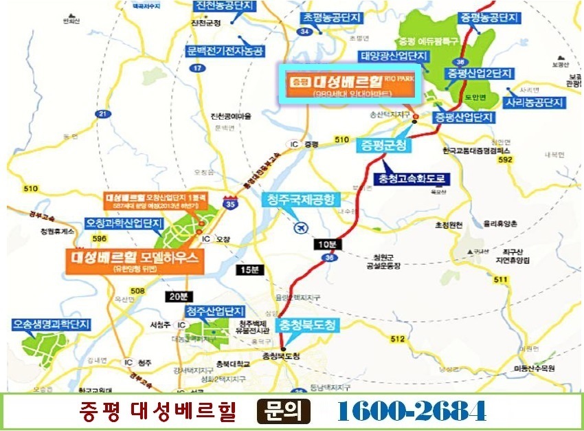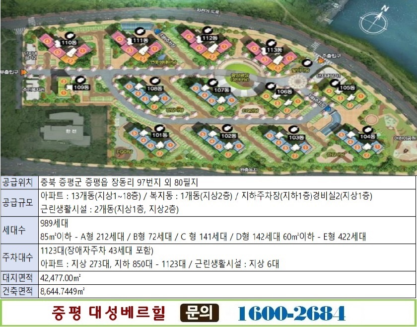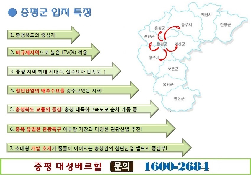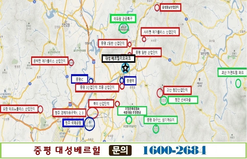 증평 대성베르힐 대단지아파트 25평형~34평형 분양&즉시입주. 실투자금 2천~3천만원, 10분거리 산업단지 밀집, 증평역 인접.