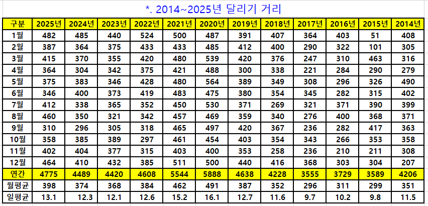 - 연간 운동 목표 : 4,200키로 - 풀코스 117회 (2:44:19) 서브-3 : 57회