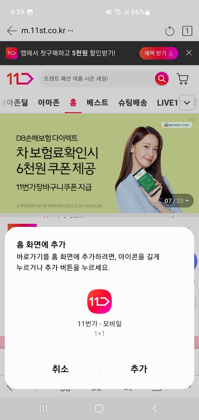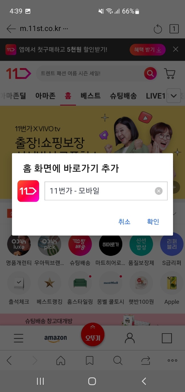 하단에 있는 버튼만 누르면 스마트폰 메인 화면에 11번가 바로가기 생성 완료