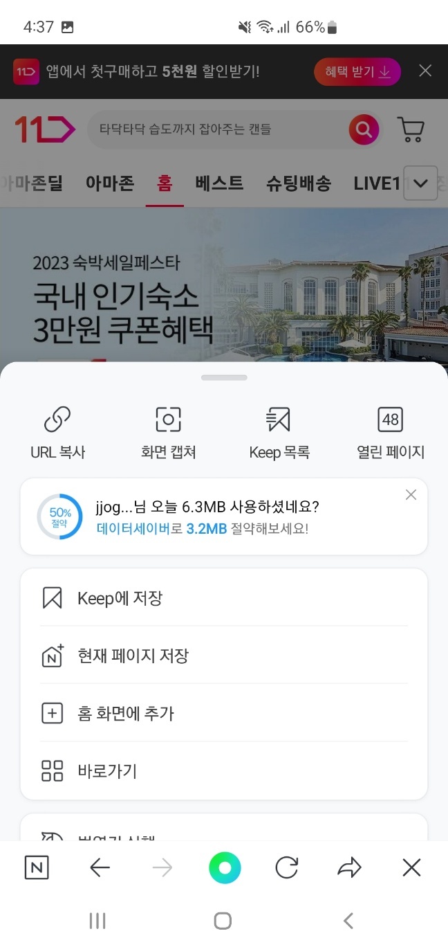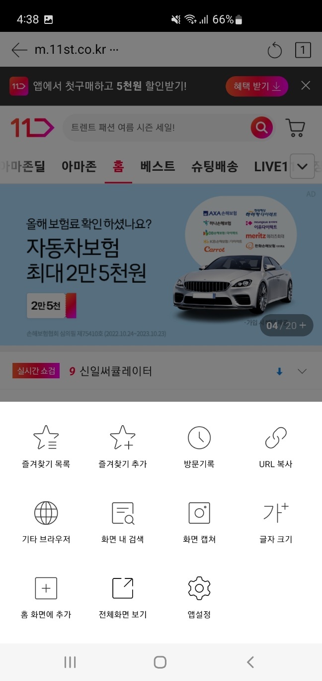 위에 보이는 11번가 화면에서 공유버튼 (화살표) 옆에 있는 점 세개 0 0 0 버튼을 누릅니다.