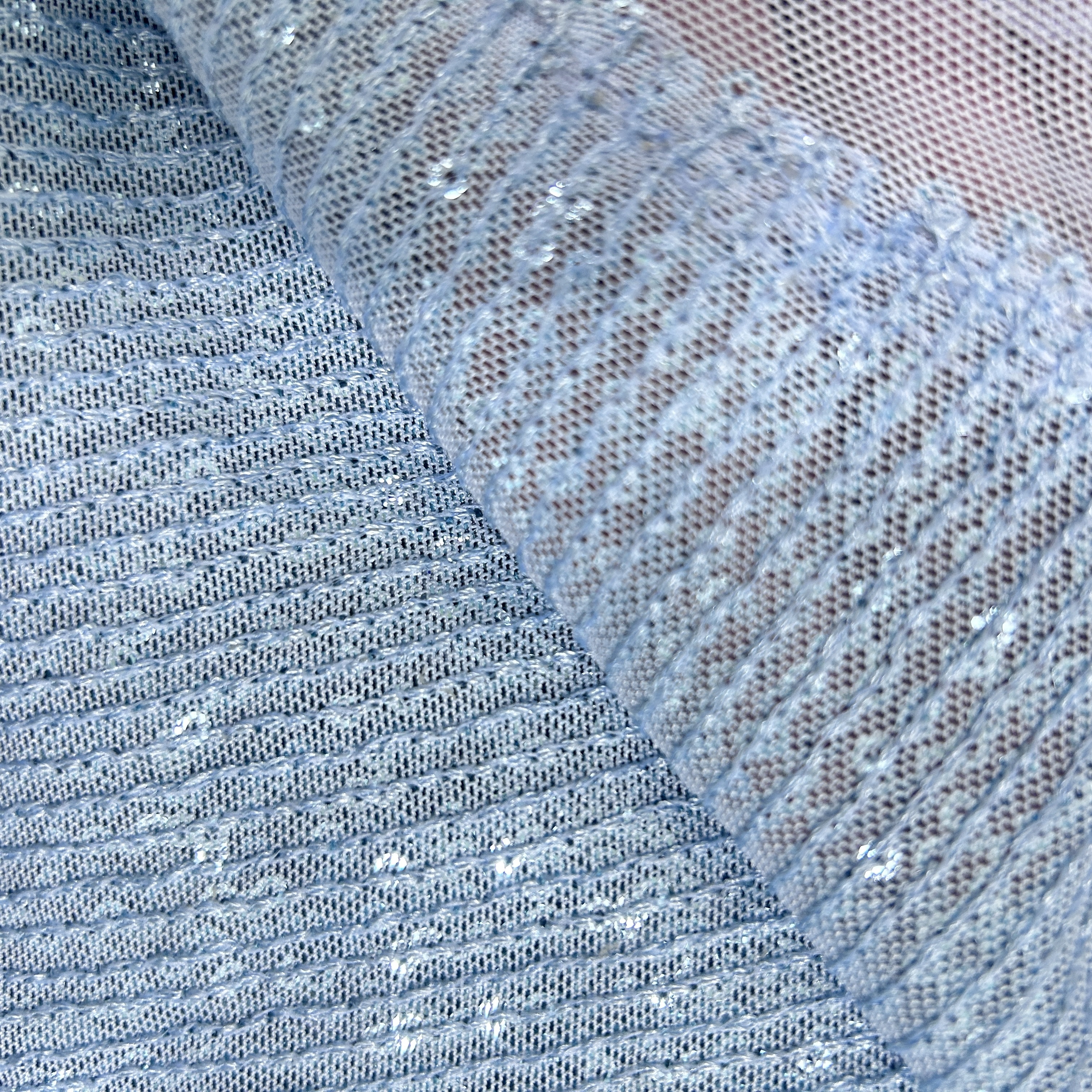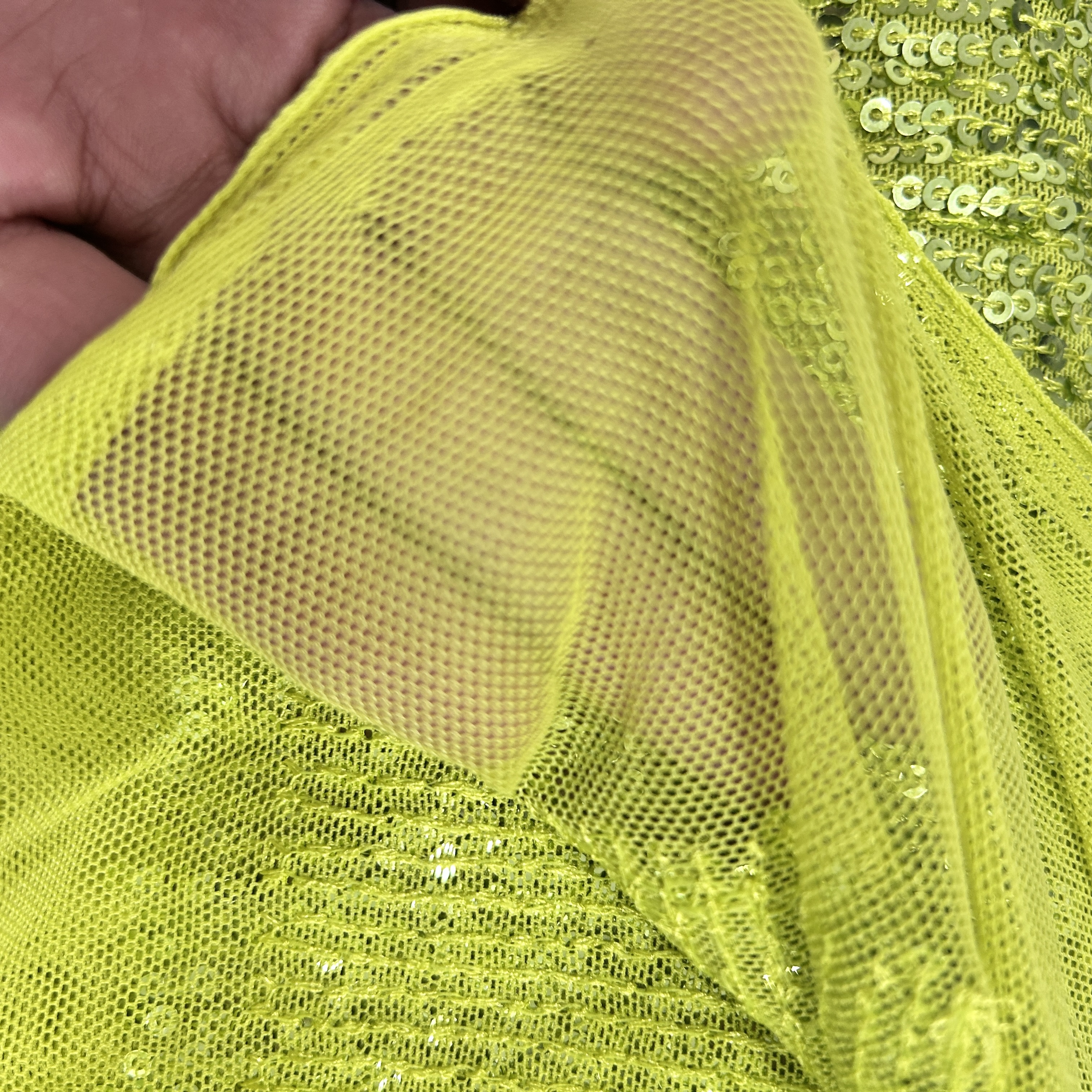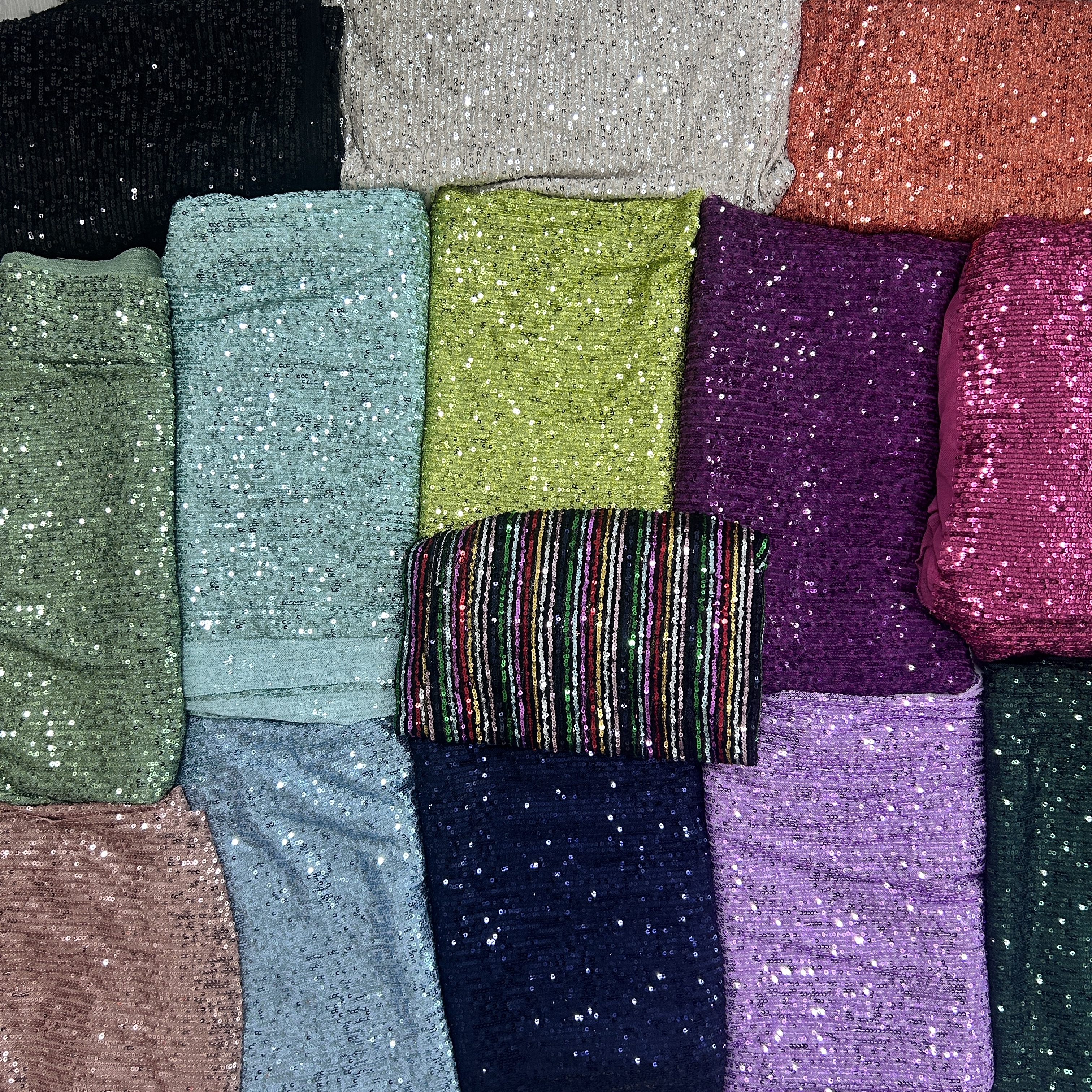 전부 재단된 자투리 스팽글 원단인데 대략 길이 1m~1.5m, 폭 1.2~1.3m 입니다. 브라질 수출용 원단인데 남은 것들입니다.