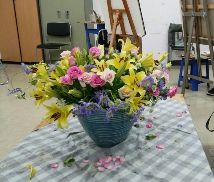 노랑 백합, 장미, 서양 솔체꽃을 범벅으로 꽂아놓은 꽃들을 ' 조걸 어떻게 잡지' 라고 벽에 기대어 생각하며 웃음으로 바라다 본다.