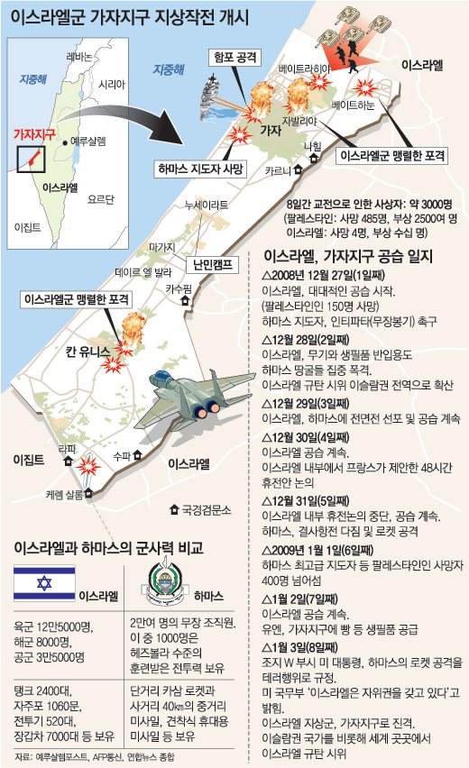 지난 3일 저녁 전격적으로 대규모 지상군 병력을 가자지구로 투입해 전면적인 지상작전에 들어간 이스라엘군은 가자지구를 남북으로 차단한 후 북부 하마스 로켓탄 발사지역을 대부분 장악한 데 이어 4일 새벽에는 가자지구의 허리를 관통해 남북으로 가자지구를 분리한 후 가자지구의 중심도시인 가자시티를 포위한 채 시가전을 준비 중이라는 소식입니다.