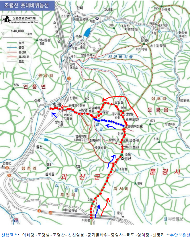 | 산 행 경 로 | A코스 : 이화령 휴게소-조령샘-조령상(정상)-안부-신선암봉-청암사(중암사)-마당바위-절골-에바다기도원-신풍산업 -연풍역 [약 10.0km, 6시간-중식포함, 후미기준] B코스 : 이화령 휴게소-조령샘-조령산(정상)-안부-절골-에바다기도원-신풍산업-연풍역 [약 8.0km] | |