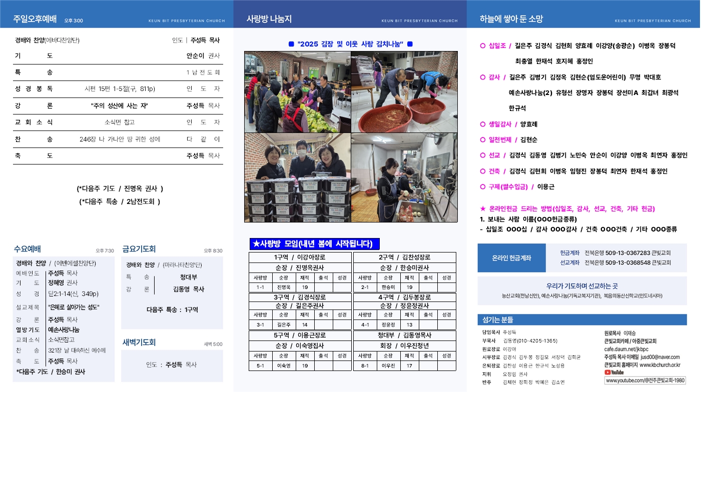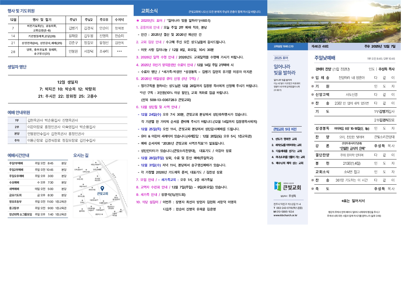2025년 12월 7일 교회주보 작성자김동영전도사|작성시간25.12.06|조회수10 목록 댓글 0 글자크기 작게가 글자크기 크게가 다음검색 현재 게시글 추가 기능 열기 북마크 공유하기 신고 센터로 신고 댓글 댓글 0 댓글쓰기 답글쓰기 댓글 리스트