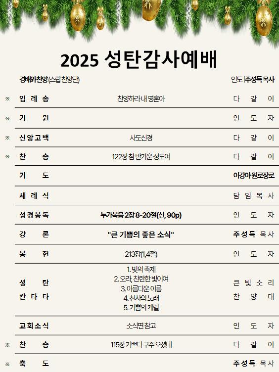 2025년 12월 25일 성탄감사예배 주보 작성자김동영전도사|작성시간25.12.24|조회수6 목록 댓글 0 글자크기 작게가 글자크기 크게가 다음검색 현재 게시글 추가 기능 열기 북마크 공유하기 신고 센터로 신고 댓글 댓글 0 댓글쓰기 답글쓰기 댓글 리스트