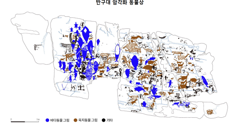 어 on that 어 drawing uh we can find the many kind of animal people uh especially marine animal like uh whale and the field animals like deer and wild pig and uh many kind of uh exact forms of animal and fish