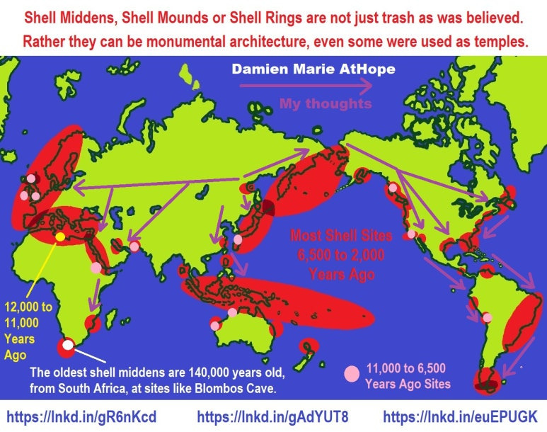 조개무지와 고인돌의 분포는 완벽하게 같습니다. 홍수 후에 사람들은 먼저 바닷가로 이주했습니다. 내륙은 동물과 사람의 시체와 진흙으로 살 수가 없었을 것입니다. 그리고 노아 방주의 배를 만드는 기술은 앞섰고 바다는 오염이 되지 않고 지천의 먹거리가 있었습니다. 천국이 따로 없는 삶을 인류는 적어도 4000년을 살았습니다. 다툼도 없고 스트레스도 없었습니다. 넓은 땅과 바다 들과 강이 온 지구에 있고 인구는 별로 없었기에 그랬고 한반도에 처음 상륙한 사람도 천국을 맛을 보면서 자녀를 낳고 경상도로 전라 북도로 이주를 시작했고 철기가 들어올 무렵까지 약 1000년의 천국의 삶을 맛을 봅니다. 진정한 인류의 역사이요 우리 민족의 역사입니다.