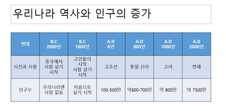 청동기 시대에는 인구가 1천만 명 정도밖에 되지 않았고, 그 다음 시대는 철기 시대였습니다. 철기를 가진 사람들이 고조선, 부여, 고구려 같은 북쪽 지역에서 이주해 왔고, 평화로운 한국 사람들을 침략하여 고구려, 신라, 백제, 삼국을 건설했습니다.