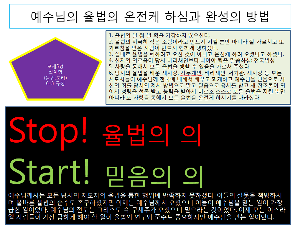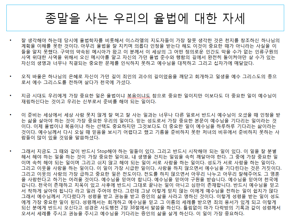 할레루야! 선한 길로 인도하시는 하나님 아버지! 오늘도 지혜를 주시고 함께 하셔서 이렇게 파워포인트 자료로 율법에 대해서 공부하게 해 주심을 감사드립니다. 무엇보다도 열심히 복음을 전해야 됨을 다시 각성시켜주심도 감사를 드립니다. 성령님의 인도하심에 따라서 때를 얻든지 못얻든지 어디서나 복음을 전하는 일을 가장 먼저 해야 되겠습니다. 늘 성령의 충만으로 예수님의 증인의 삶을 잘 살게 인도하여 주옵소서 그리고 예수님의 재림을 잘 준비하고 기다리는 저희 모두가 되게 지켜주옵소서!