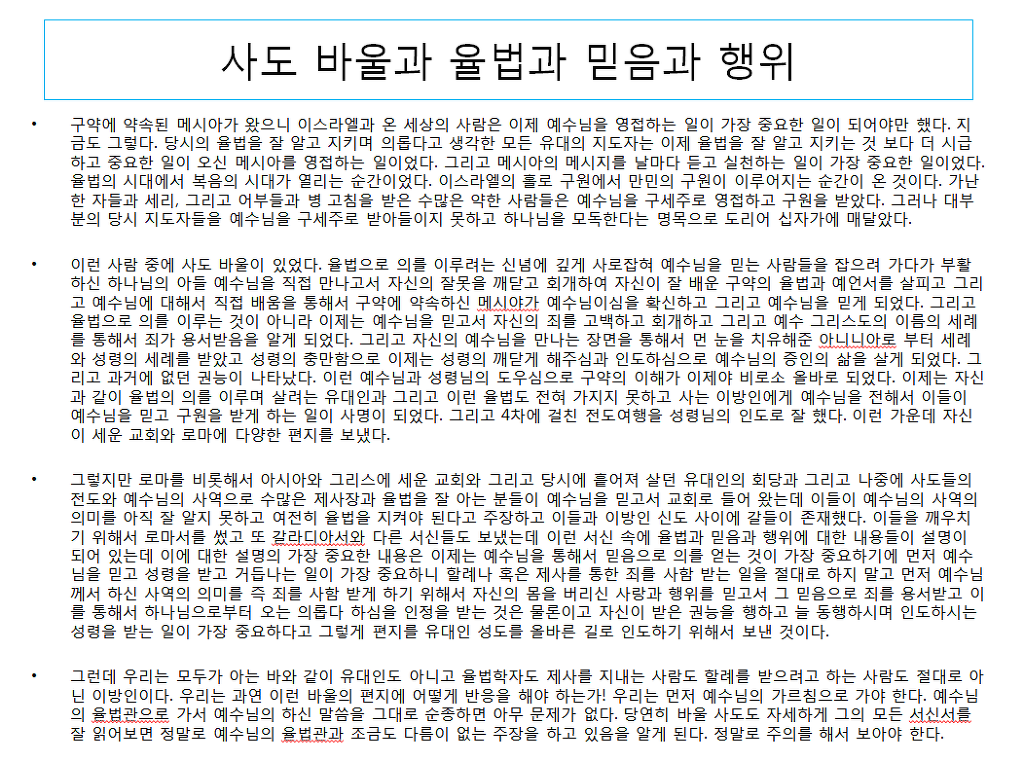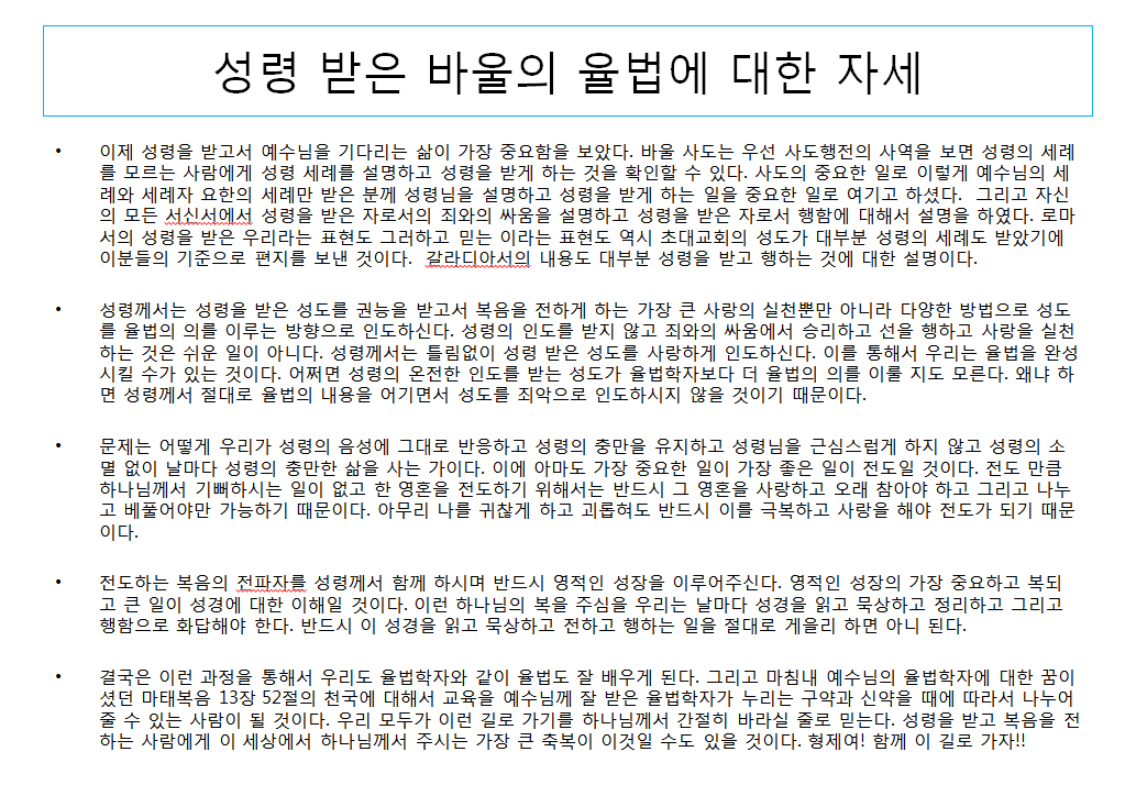 제가 파워포인트로 율법과 예수님 그리고 바울 사도의 편지에 대해서 설명을 했는데 최근에는 오직 글만 블로그와 카페에 올렸는데 오늘은 파워포인트로 정리할 지혜가 왔고 마무리도 성령님의 인도로 하게 되었습니다. 컴퓨터로 보면 잘 보이는데 핸드폰으로 글씨가 잘 보일까 합니다. 컴퓨터로 확인해 보시기 바랍니다.