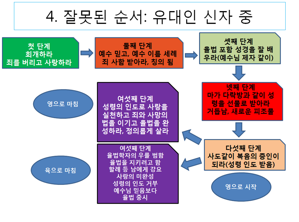 제게 주신 은혜대로 그 내용의 이해를 그림으로 표시를 했습니다. 유대인 성도가 참으로 많고 이들이 율법에 얼마나 빠져 있는지는 앞에서 설명을 했습니다. 이들이 율법을 따라서 성령의 인도를 받기를 거부하고 위의 절차를 무시하고 예수님을 믿는 믿음 생활보다는 과거의 예수님께 책망을 받은 것과 같이 율법의 정신을 버리고 율법의 조문을 지켜서 의를 이루고자 하고, 또 장로의 유전을 따라서 율법 자체를 부정하는 삶을 산 율법학자나 바리새인과 같이 신앙생활을 하고, 또 나아가서 이들이 율법을 잘 안다고 율법을 모르는 이방인 성도에게 위의 절차와 같은 예수님께서 원하시는 신앙생활을 하도록 인도를 하는 것이 아니라, 먼저 율법을 배우고 율법을 따라서 사는 삶을 강요하기에, 이는 예수님의 믿음을 통한 죄 사함과 의롭게 됨을 무너뜨리고 성령을 받는 길을 금하고 마침내 성령의 삶이 아닌 육의 삶으로 인도할 수 있기에, 이는 예수님께서 오신 의미를 십자가의 의미를 저버리게 하는 너무나 잘못된 행위이기에, 로마서나 다른 서신서에서 율법이 아니고 율법의 행위가 아니라고 그렇게 강조를 하고 있는 것입니다. 이런 의미에서 사도바울께서 예수님을 믿어서 죄를 용서를 받고, 의롭게 되고 그리고 성령을 받고, 그리고 성령의 인도를 받으면서 살라고 강하게 반복해서 말씀을 하고 있는 것입니다. 사도바울께서는 절대로 율법을 버리라는 말씀도, 지키지 않아도 된다는 말씀도, 또 세상에서 사랑을 실천하기 위해서 반드시 따라야 하는 율법의 행위를 하지 말라는 말씀도 아니 하시고 있음을 굳게 믿으시기 바랍니다.