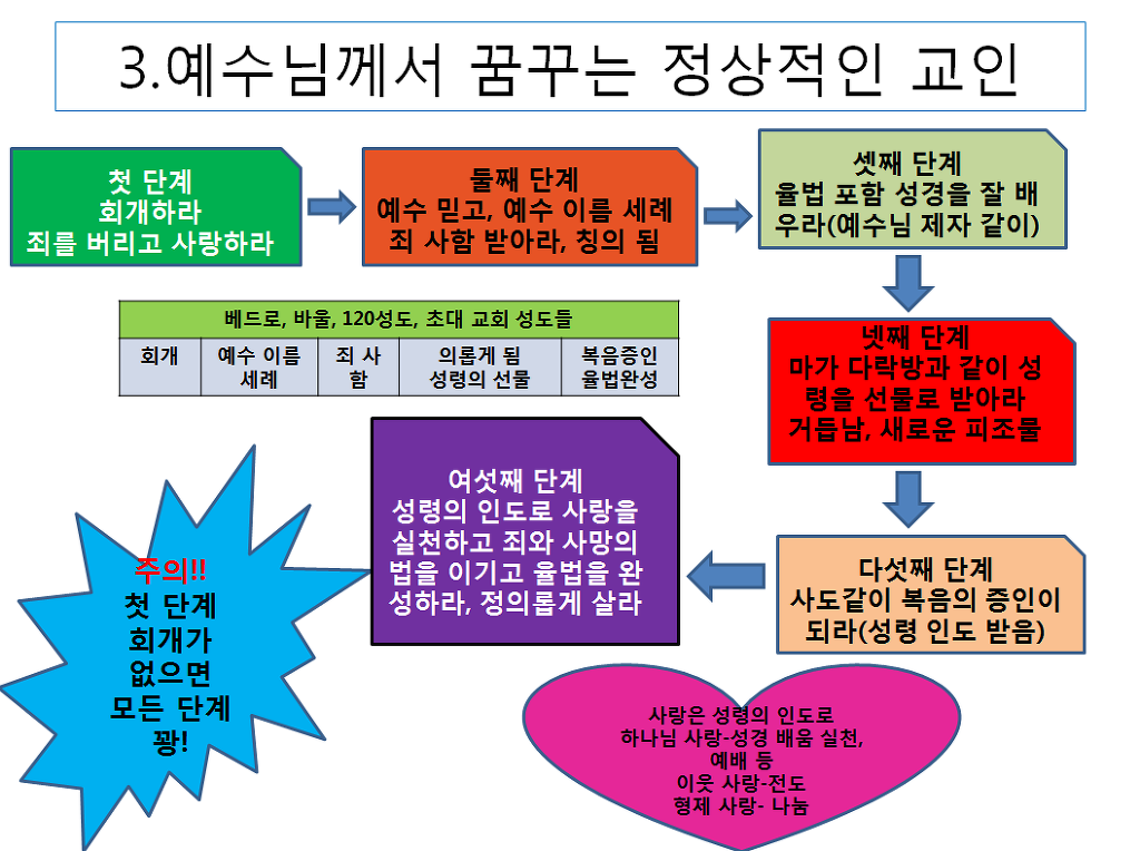 이제 다시 세 번째 시간으로 돌아갑니다. 권사님의 맛있는 김치 한 포기가 이렇게 한 지친 인간에게 힘을 줍니다. 세상을 살다 보면 모든 진을 다 빼놓는 사람을 만나기도 합니다. 하루 종일 참으며 사랑을 해 주어도 그 사랑 알지 못합니다. 내 진이 다 빠지게 참고 사랑을 해도 또 덤빕니다. 그래도 사랑을 해야 합니다. 그런데 믿는 이의 격려는 이렇게 새 힘을 줍니다. 우리는 서로 사랑하고 격려하고 그리고 힘을 주고 살아야 합니다. 제 글의 어떤 부분에 대한 지적은 이 시대의 잘못된 목자나 신학에 대한 부분이 많고 일반 성도에 대한 내용을 많지가 않습니다. 성도는 힘들게 세상에 살고 돈을 벌어서 교회에 헌금 내고 목사님을 섬기면서 삽니다. 너무나 힘들게 살고 있고 저도 그렇게 오랫동안 살았습니다. 불의한 세상에 분노를 가지고 살고 있습니다. 안타까운 교회의 모습에 때로는 분노하고 마음 아파하며 살고 있습니다. 과연 예수님께서는 어떤 교인을 꿈꾸시며 그 무겁고 무서운 십자가를 지셨겠습니까? 저는 성경의 순서 즉 사복음서와 사도행전과 그리고 로마서를 보면서 그동안의 예수님의 깨닫게 해 주심과 성령의 인도를 따라서, 그리고 직접 성령을 받고서 오랫동안 복음을 전한 체험에 따라서 아래와 같이 정리를 해 보았습니다. 보시겠습니다.