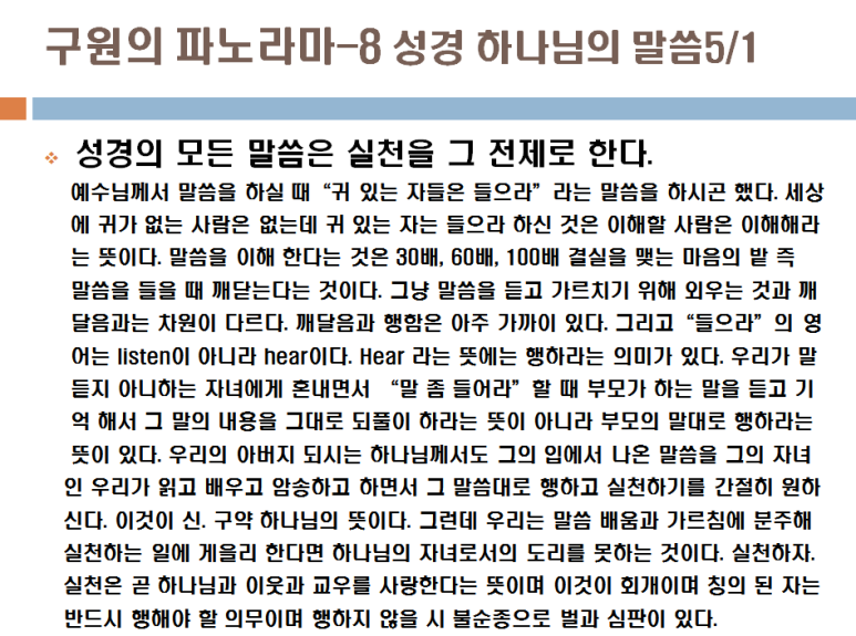 샬롬! 구원의 파노라마 8번째 주제는 성경 말씀입니다. 모든 믿는 사람은 성경책을 한 권 이상은 가지고 있고 믿지 않는 분들도 상식을 넓히고 온 세상의 사람들이 가장 많이 읽는 책인 성경을 읽습니다. 참으로 복이 많은 시대에 우리가 살고 있음을 모든 사람이 각국의 언어로 성경을 읽을 수가 있다는 것입니다. 우리나라만 해도 성경책이 처음 들어온 것은 조선시대 1600년대 초 이수광의 지봉유설에서 천주실의를 소개한 것일 것입니다. 천주실의는 청나라에 온 선교사 마테오 리치의 글을 번역한 것으로 알고 있는데 성경책이 아니고 성경의 내용을 설명한 책입니다. 천주교 전래의 효시가 되는 책입니다. 그리고 1592년 임진왜란 때 스페인 선교사가 일본의 병사를 따라서 조선에 와서 미사를 드리기도 했습니다. 당연히 성경책을 가지고 왔고 조선의 백성에게 선교에 대해서 열망이 있었을 줄로 믿습니다. 진주박물관에 쎄쓰데베스가 교황에 보낸 편지가 있습니다. 비록 통일 신라시대에 당에서 유행하던 경교가 들어왔다는 여러 유적을 통한 주장이 있지만 이에 대한 연구들이 더 진행이 되어야 할 줄로 믿는데 성경책이 한국에 들어온 것은 천주교의 선교와 함께 그리고 개신교 선교사들의 입국과 함께 이루어졌으니 이 긴 역사의 나라에서 별로 오래전의 일이 아닙니다. 한국뿐만 아니라 온 세상이 다 그렇습니다. 성경책을 볼 수가 있는 사람은 극히 제한이 되었습니다. 성경책이 지금과 같이 금속활자로 인쇄가 되지 않아서 모두가 필사를 했고 그리고 지금과 같이 종이도 먹도 발달하지 않았기에 양피지에나 대나무에나 혹은 이집트의 갈대에 기록을 했습니다. 그리고 히브리어 헬라어로 기록이 되었고 이를 읽기 위해서는 다른 언어로 번역이 되어야 하는데 서양에서 라틴어로 된 성경을 루터가 약 500년 전에 독일어로 처음 번역을 했다고 하니 지금과 같이 물이 바다를 덮는 것과 같이 하나님을 아는 지식이 넘쳐날 수 있게 모두가 성경책을 가지고 모두가 자국의 언어로 성경을 읽게 된 것은 별로 오래전의 일이 아니기에 지금의 시대를 사는 모든 인류는 복 중에서 가장 큰 복을 받고 살고 있는 것입니다.