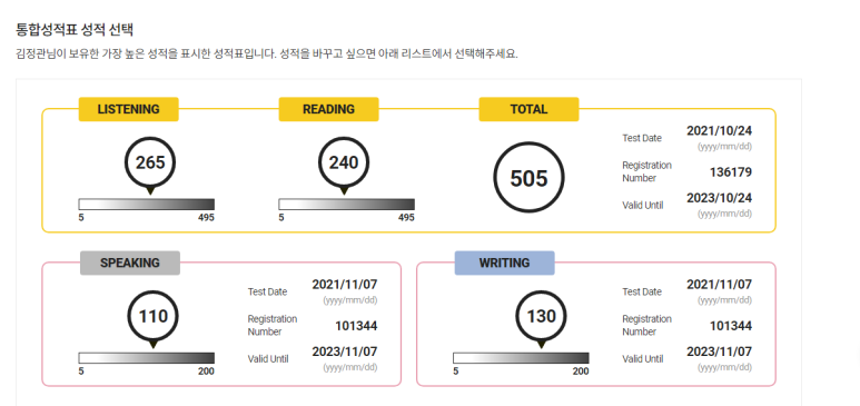 저를 위해서도 꼭 기도해 주시기를 부탁을 드리면서 저도 쉬지 않고 어디서나 언제나 모든 분을 위해서 기도하겠습니다. 열심을 주시고 지혜를 주시고 주변의 모든 문제를 해결해 주심으로 더욱 공부에 집중할 수가 있도록 그리고 배우는 즐거움이 충만하도록 기도하겠습니다. 제 현제의 토익 점수입니다. 다시 시험을 몇 달이 있다가 볼 것인데 점수가 많이 향상이 되길 바라고 있습니다.